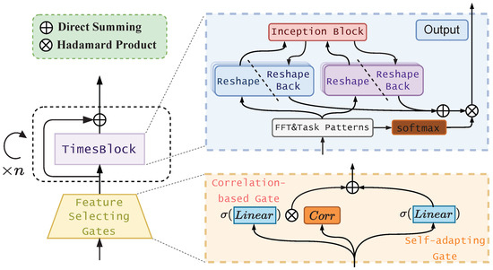 Finally, we kept the same design of adaptive aggregation and residual connection of TimesNet. Note that refers to the relation to the next layer in Equation (4). Amplitudes reflect the different importance of diverse interperiod patterns; thus, the adaptive aggregation in Equation (5) integrated them into more holistic intraperiod patterns.