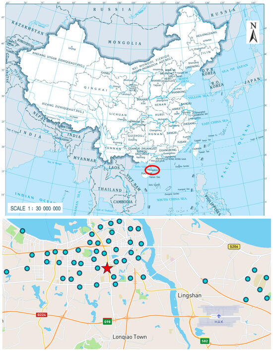 The red circle in the top image represents the city of Haikou, which is the location of data sampling. This city is situated in Hainan Province, China. The bottom image displays the distribution of sampling points within the city of Haikou. The observation station is located between longitudes 110 9.6 and 110 32.4 and latitudes 19 57 to 20 0. The red star in the diagram denotes “MeiLan”. Results pertain to a subset of MeiLan, which is utilized as a subdataset in the following experimental section.