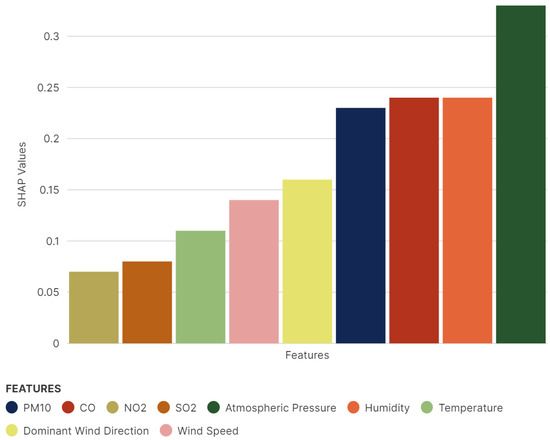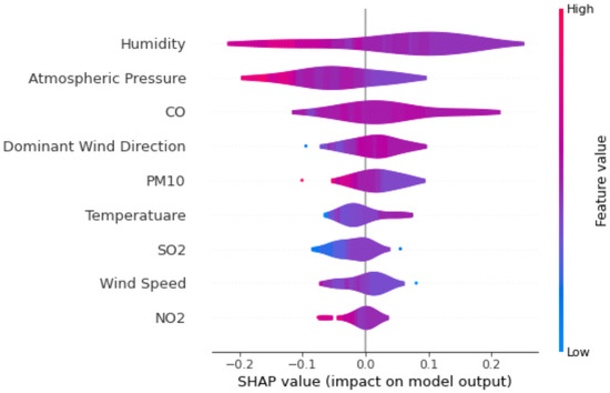 Figure 4 illustrates the local perspective of Shapley analysis from a single dataset sample. The horizontal axis of the displayed figure represents the input features, while the vertical axis showcases the SHAP values for the nine features under examination. From a local perspective, “atmospheric pressure” exhibits the most pronounced influence on the variation in PM2.5 concentration. This dominance of atmospheric pressure can potentially be attributed to its integral role in modulating atmospheric stability, which in turn affects the dispersion and concentration of particulate matter. Intriguingly, “CO”, “humidity” and “PM10” manifest equivalent significance in the chart, indicating their equal footing in the determination of PM2.5 fluctuations. The illustration further underscores the nuanced interplay of various environmental factors in shaping PM2.5 dynamics.