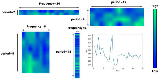 where is the set of frequencies of n time period of our PM2.5 prediction task. Consequent modeling procedures were the same as the original TimesNet. Following this, we reshaped the 1D time series into many 2D stacked time-series fractions, , according to the frequencies list and corresponding period length. This is shown as