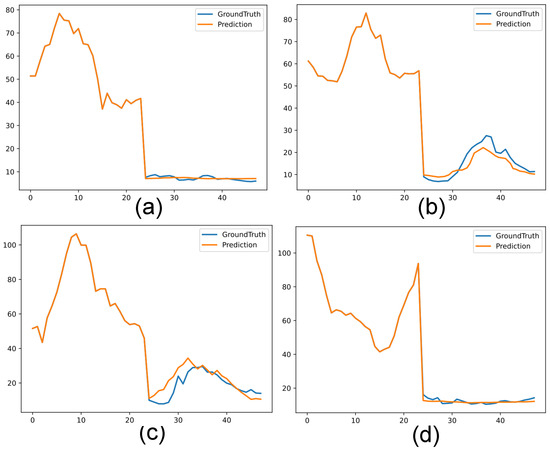 For the randomly selected four samples, we plot the comparison between the actual values and the predicted values, as shown in (a–d). The orange line represents the actual values, while the blue line indicates the predicted values. The prediction length is 24, corresponding to the 25–48 h segment in the graph, encompassing the four-time patterns we aim to predict: 1 h, 6 h, 12 h, and 24 h.