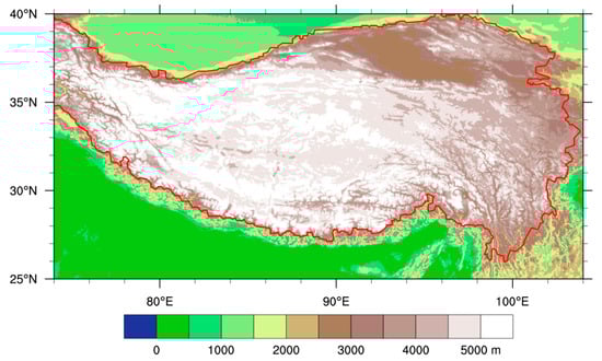 Also employed was a 0.5° × 0.5° grid-point dataset of normalized daily temperature from national surface meteorological stations in China as the actual data to compare with the model results. The source of this dataset comprised two parts: (1) China’s National Surface Meteorological Station Normalized Temperature Daily Value Data Set (V1.0) developed by the National Meteorological Information Center and (2) the 2′ × 2′ digital elevation model of China’s land produced by ETOPO5 (Earth topography five-minute grid) Global Surface Relief. In addition, we selected the study area with a terrain height of more than 3000 m (Figure 1), for which the plateau boundary was based on the ETOPO5 data [36].