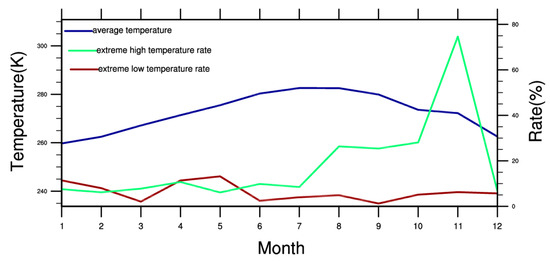 Average monthly temperature and occurrence rate of extreme high/low temperatures in the plateau region.