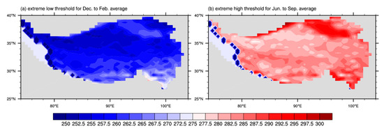 Distribution of (a) extremely low-temperature thresholds from December to February and (b) extremely high-temperature thresholds from June to September in the plateau region (unit: K).