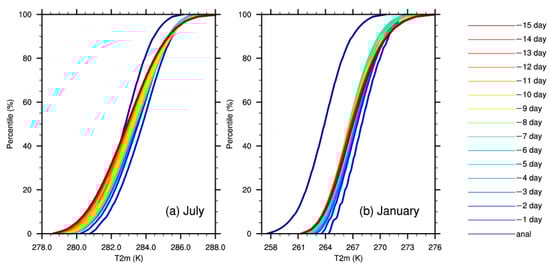 To test the climate percentile of 2-m temperature in summer, we chose July as a representative for analysis. From Figure 4, we can see from the model deviation for the actual temperature below the 50th percentile that the climatological curves of each lead time are located near the actual climatological curves; that is, the forecast effect of the model on the percentile is better, but the climatological curves under each forecast period are scattered, and the forecast stability of the model is poor. Meanwhile, for temperatures above the 50th percentile, the climate percentile of the model has a certain degree of warm bias, and the climatological curves under each lead time are relatively concentrated; that is, the forecast stability of the model is relatively high. However, for the extremely high temperatures that we are more concerned about in summer, the warm bias of the model is more obvious, and the warm bias decreases slightly with the increase in lead time.
