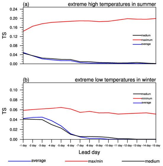 According to the above analysis, it can be seen that, for the average climatological extreme temperature in the plateau region, the threshold values of the model and the actual situation are different, and the difference is different under each lead time. To further illustrate the effect of the model on the extreme temperature forecast in the plateau region, the 90th and 10th percentiles of the climate state are selected as the thresholds of extreme high temperature and extreme low temperature; the arithmetic mean, maximum value, minimum value, and median of the ensemble model are used for deterministic forecasting; and the threat score (TS) is used to test the model forecast.