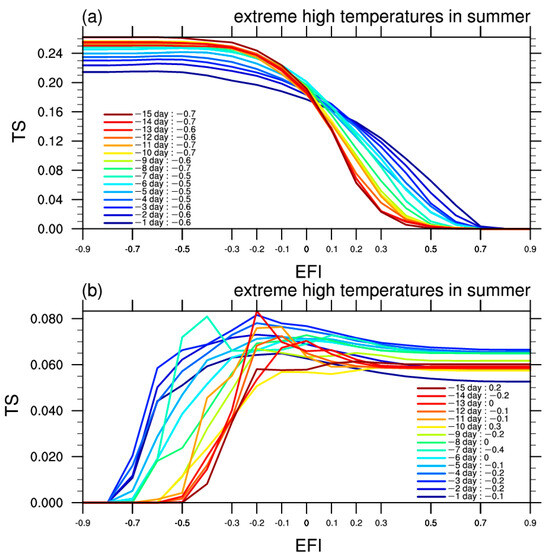 TSs for forecasting (a) extreme summer high temperatures and (b) extreme winter low temperatures with different EFI thresholds under each lead time.