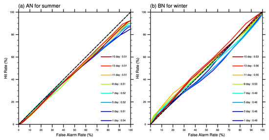 ROC curves of (a) extreme summer high-temperature and (b) extreme winter low-temperature forecasts in the plateau region using the EFI at each lead time.