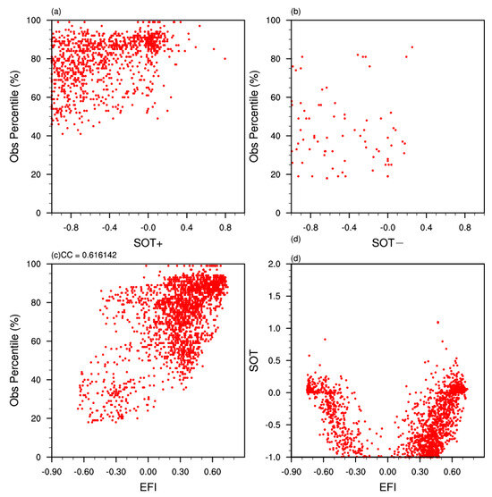 Scatter plots of (a) , (b) , and (c) EFI at the three-day lead time versus the percentile of real temperature in the historical period, and (d) the EFI and SOT index scatter plots for the plateau region.