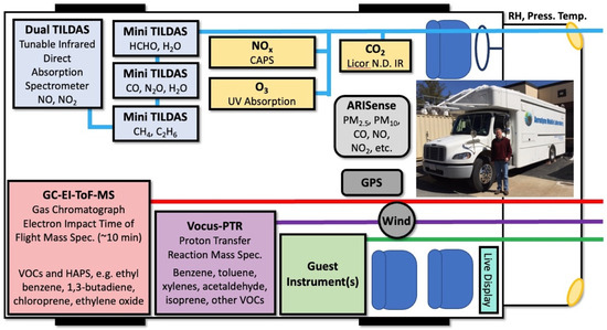 The AML hosts a suite of research-grade instruments [1,2,7]. The current version is a diesel truck powered by two additional on-board diesel generators. The AML sampled continuously throughout the 6-week measurement period. When parked overnight at the Dearborn monitoring station, it used on-site power, with AML generators turned off.