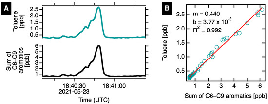 Time traces (A) and correlation plot (B) of toluene versus the sum of C6–C9 aromatics. The molar ratio is taken from the slope of the correlation plot, m = 0.440.