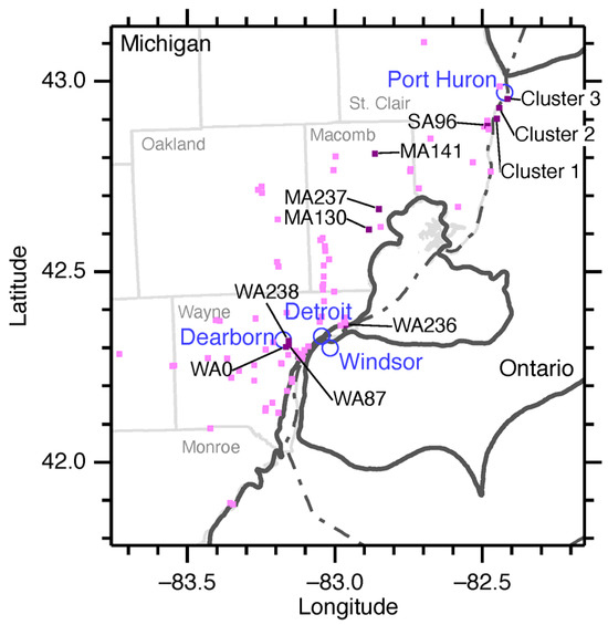 Overview map of study area showing Michigan and Ontario boundaries. Select cities (blue) and Michigan counties (grey) are labeled. Visited/measured sources are shown as pink dots, with those sources characterized here shown in darker pink and labeled with their site ID. Shorelines: NOAA [22], county lines: State of Michigan [23].