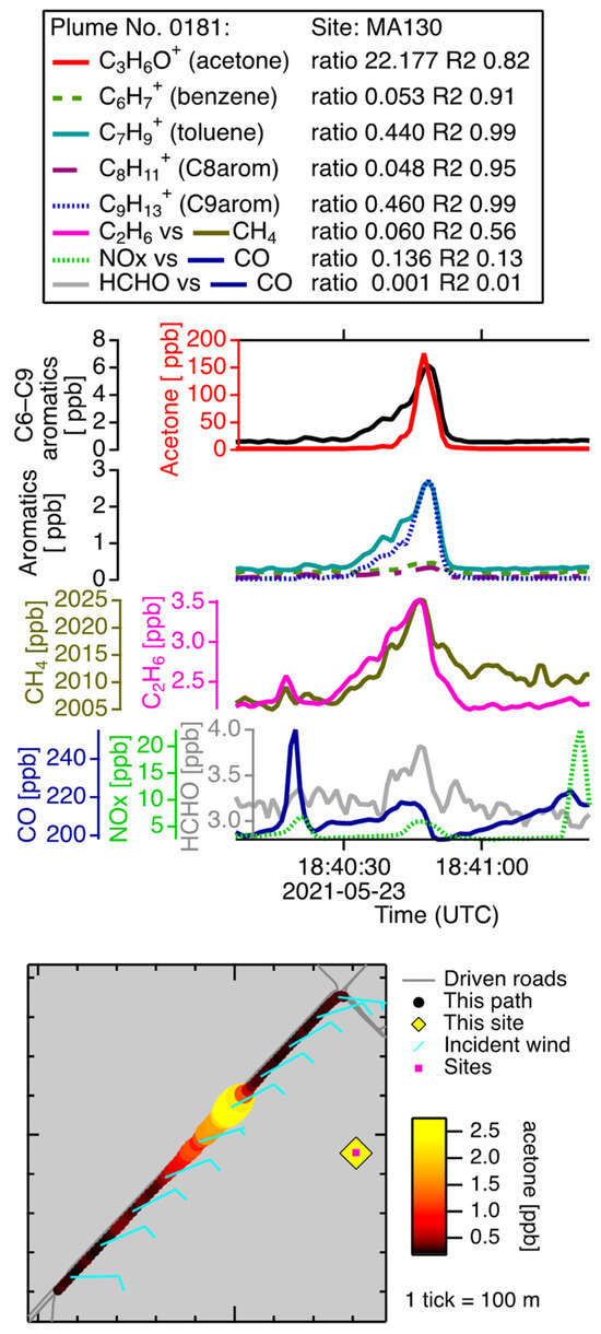 Example chemical fingerprint for Facility MA130. Ratios of VOCs to the sum of aromatics and R2 of the linear fit are listed beside their trace name (top). Additional ratios for other gas phase tracers are noted versus their denominator. Time traces for selected traces are shown (middle). A map (bottom) shows concentration over the driven path.