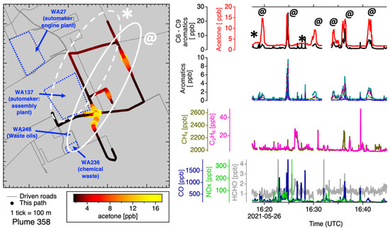 The clearest separation of the automaker assembly plant WA137 and chemical waste facility WA236 occurred on 26 May 2021 with wind from the SE (Figure 5). In this figure, a mixed VOC plume (@ symbol) is observed along with a broader, primarily acetone plume (* symbol) further to the north. Sharp and brief spikes of aromatics and CO show the impact of local traffic on these busy boulevards. We attribute the southern-most plume (@ symbol, enhancements of many VOCs) to the WA236 chemical waste facility. The northern-most plume (* symbol, primarily acetone on this day) originates from the automaker assembly plant WA137 or nearby.