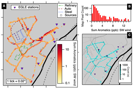 Sum of C6–C9 aromatics during Dearborn Loops under SW winds. (A) shows average concentrations. EGLE monitoring stations (purple triangles), inventory sources (white squares) and the outlines of 3 major facilities (WA87—automaker; WA0—steel; WA22—refinery) are also drawn. (B) shows a histogram of the measured concentrations in each map pixel, on a log scale. (C) shows the number of measurements in each map pixel, as well as roads driven over the course of the campaign.