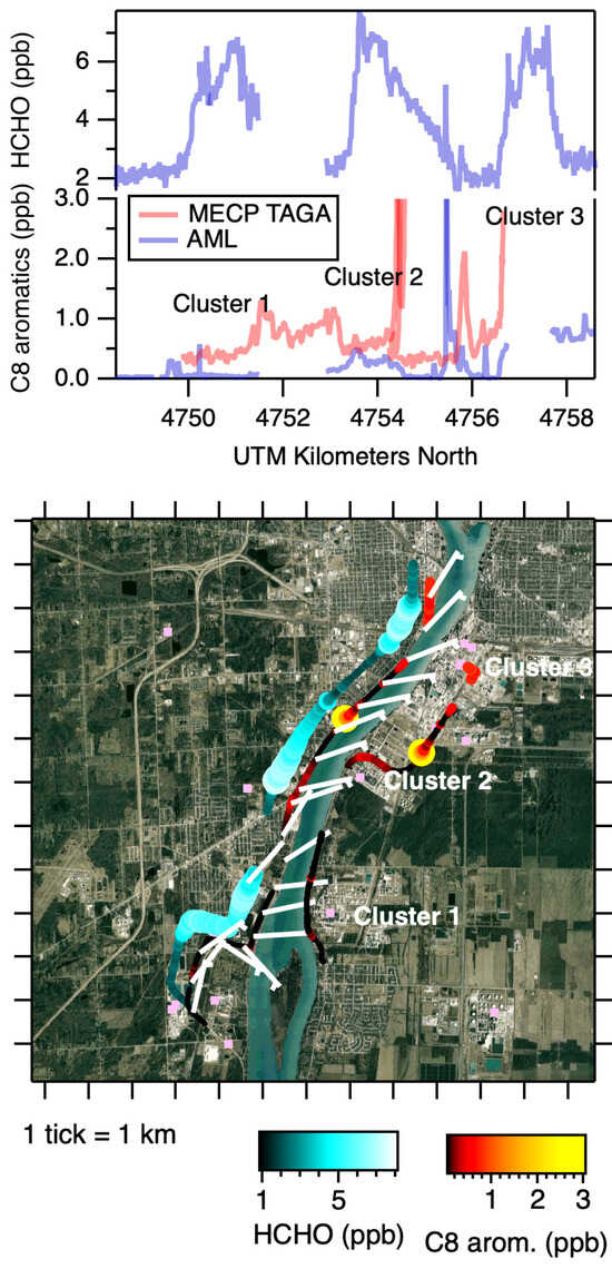 Figure 7 below shows a river-side drive of the AML and MECP TAGA from south to north, with dominant winds from the refineries to the East. Though there are numerous individual facilities on the Canadian side, three refineries dominate the area. We number them clusters 1, 2 and 3 from south to north. Just north of Cluster 2 are two additional petrochemical sites: a rubber manufacturer with reported 1,3-butadiene emissions, and a styrene manufacturer. South and inland of Cluster 1 is another petrochemical plant producing ethylene. The map in Figure 7 clearly shows enhancements of aromatics on both sides of the border surrounding Clusters 2 and 3, whereas concentrations are lower near the Cluster 1 facilities to the south.