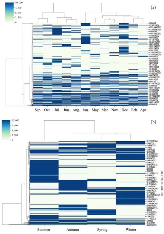 Hierarchical cluster analysis (HCA) of PM2.5 samples in 12 months (a) and 4 seasons (b) in the rural site of Quzhou County, the NCP. The closer the dendrograms are in the horizontal and vertical directions, the more similar the chemical composition of the samples is. Darker colors represent higher concentrations of compounds.