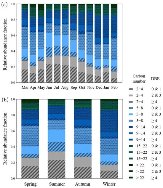 Distribution of the carbon number and DBE of monthly samples (a) and seasonal samples (b). The colors indicate different carbon number distributions and DBE subgroups.