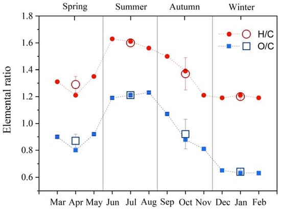 Plots of the O/C (red) and H/C (blue) values of organic compounds in monthly and seasonal PM samples collected in the rural site of Quzhou County, the NCP, from August 2020 to July 2021. The solid circle refers to the H/C (red) or O/C (blue) observed in each PM2.5 sample, while the hollow circle refers to the average H/C (red) or O/C (blue) observed in each seasonal PM2.5 sample.