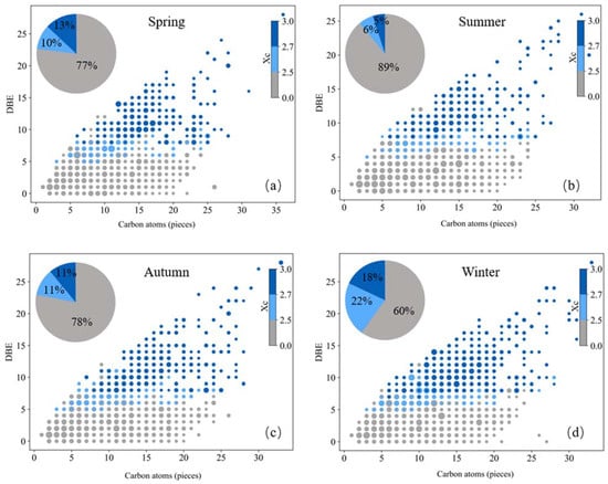 Double bond equivalent (DBE) versus carbon number of organic compounds for the four seasons, i.e., (a) spring, (b) summer, (c) autumn and (d) winter. The color bar denotes the aromaticity equivalent (gray (XC < 2.50), light blue (2.50 ≤ XC < 2.71) and dark blue (XC ≥ 2.71)). The size of the circles corresponds to the power of the fourth root of the peak abundance of individual compounds. The pie charts represent the percentage of each XC category.