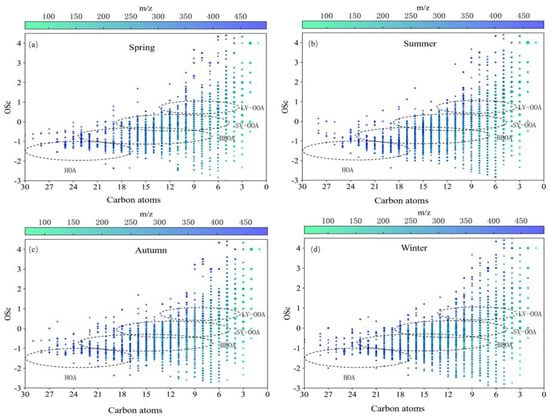 Figure 5 shows the Oxidation State of Carbon (OSc) as a function of the carbon number for samples collected during the spring, summer, autumn and winter, which can be used to identify potential sources of organic aerosol components. According to previous studies [3,28,37], the molecules with an OSc between −1 and −2 with 18 or more carbon atoms are suggested to be associated with hydrocarbon-like organic aerosol (HOA). The molecules with an OSc between −1.25 and −0.25 with 7–23 carbon atoms are associated with biomass burning organic aerosol (BBOA) that is directly emitted into the atmosphere. The molecules with an OSc between −0.5 and + 0.25 with 5–18 carbon atoms are associated with semi-volatile oxygenated organic aerosol (SV-OOA), while the molecules with an OSc between +0.25 and +1.0 with 4–13 carbon atoms are associated with low-volatility oxygenated organic aerosol (LV-OOA). As shown in Figure 5, the identified organic compounds in different seasonal samples had an intense distribution in four circles, which illustrates the diversity and complexity of the sources of atmospheric OA in the rural site of Quzhou County, the NCP. A large amount of BBOA was found in all of the seasons, indicating that biomass combustion events occurred frequently [30]. This observation agrees well with the previous studies, showing that biomass burning is an important OA source in rural regions [53,59]. Interestingly, more BBOA-associated molecules were obtained in both the summer and winter samples, which may be related to the summer wheat harvest in the NCP region and the burning of materials for heat in the winter, respectively [59,60,61]. In addition, more molecules attributed to LV-OOA and SV-OOA were observed in the summer compared to such compounds in the other seasons. Since LV-OOA compounds are often produced through multiple oxidation steps, it indicates that summer OA compounds may experience more intense atmospheric oxidation and aging [59,62,63].