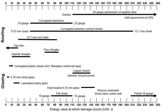 - Marshall, T.; Herzog, R.; Morrison, S.; Smith, S. Hail damage threshold sizes for common roofing materials. In Proceedings of the 21st Conference on Severe Local Storms, San Antonio, TX, USA, 11 August 2002; Transactions of the American Meteorological Society: Washington, DC, USA, 2002; p. 3. [Google Scholar]