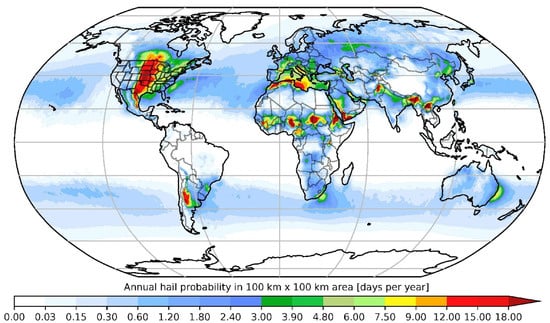 - Prein, A.F.; Holland, G.J. Global estimates of damaging hail hazard. Weather Clim. Extrem. 2018, 22, 10–23. [Google Scholar] [CrossRef]