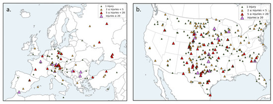 - Taszarek, M.; Allen, J.T.; Púčik, T.; Hoogewind, K.A.; Brooks, H.E. Severe convective storms across Europe and the United States. Part II: ERA5 environments associated with lightning, large hail, severe wind, and tornadoes. J. Clim. 2020, 33, 10263–10286. [Google Scholar] [CrossRef]