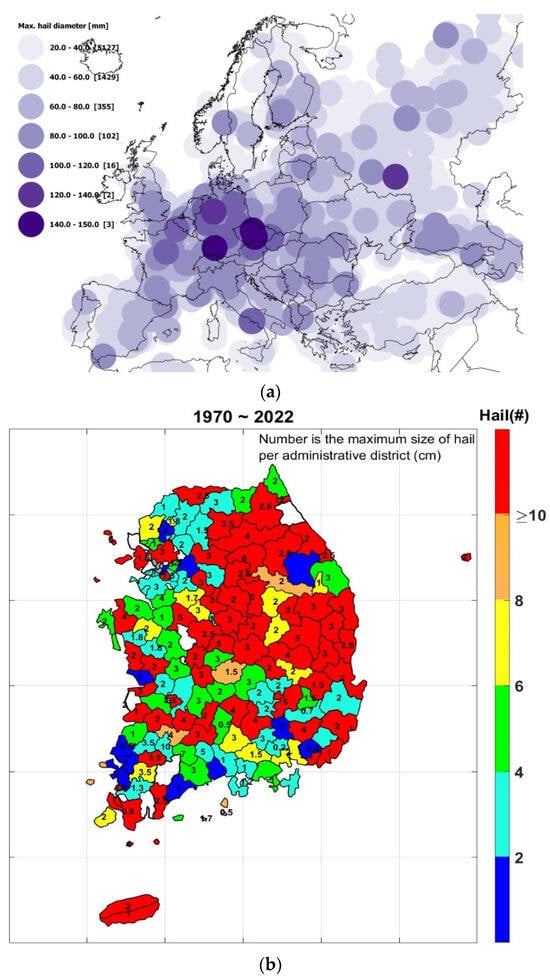 - Kim, S.; Lee, S.-J.; Shim, K.M. Hail risk map based on multidisciplinary data fusion. Korean J. Agric. For. Meteorol. 2022, 24, 234–243, (In Korean with English abstract). [Google Scholar]