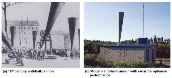 - Changnon, S.A.; Ivens, J.L. History repeated: The forgotten hail cannons of Europe. Bull. Am. Meteorol. Soc. 1981, 62, 368–375. [Google Scholar] [CrossRef]