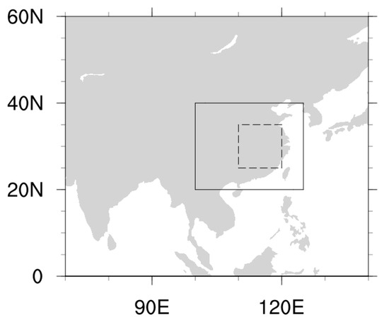 To explore the sensitivity of the analysis results to changes in the study area, we conducted the analysis on three spatial domains: (a) the “large” domain, encompassing the majority of central and eastern China; (b) the “small” domain, covering Southeastern China (Figure 1). The latitude range of a larger region is between 20° N and 40° N, while the longitude range is between 100° E and 125° E. The latitude range of a smaller region is between 25° N and 35° N, while the longitude range is between 110° E and 120° E. This region covers a vast geographical area in China, including diverse terrains and climate conditions. In terms of climatology, it encompasses various climate zones and precipitation patterns in China, ranging from subtropical humid climate to temperate continental climate, as well as highland climate and arid climate [36]. This study area also includes significant geographical features of China, such as the Yangtze River Basin, the Yellow River Basin, and the Qinghai–Tibet Plateau. Conducting climatological research in this region contributes to a deeper understanding of China’s climate change trends, precipitation patterns, and their impacts on ecosystems, agriculture, and urban planning. This is of great significance for tackling climate change, resource management, and sustainable development [37,38].