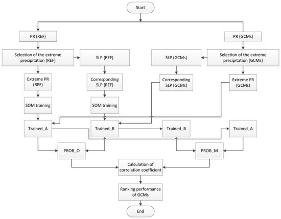 To ensure that the Self-Organizing Map (SOM) method accurately captures daily weather-scale precipitation events, this study utilized daily sea level pressure (SLP) and precipitation (PR) data from 34 Coupled Model Intercomparison Project Phase 5 (CMIP5) models [44]. The data were obtained from the Program for Climate Model Diagnosis & Intercomparison (PCMDI) archive website (https://esgf-node.llnl.gov/projects/cmip5: accessed on 3 September 2022). A time frame of 20 years, specifically from 1980 to 1999, was selected for analysis.