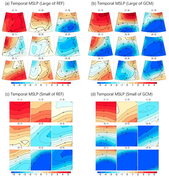 Lastly, Figure 3d demonstrates the MSLP anomaly patterns within a smaller domain from the GCM simulation. Comparing the results between the REF dataset and the GCM simulation allows for an assessment of the GCM’s capability to simulate pressure changes at different scales. If the GCM adequately simulates pressure anomalies in local regions, its global-scale simulation results would also gain credibility. However, significant deviations or errors would require further research to enhance the GCM through improved methods and techniques.