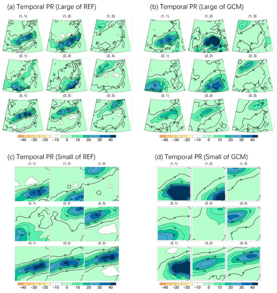 Lastly, Figure 4d illustrates the patterns of PR anomalies within a smaller domain from the GCM simulation, enabling the evaluation of the GCM’s ability to capture PR changes at different scales. Comparing the results between the REF dataset and the GCM simulation allows for the assessment of the GCM’s performance in representing PR anomalies in local regions, leading to improved simulations and predictions on a global scale.