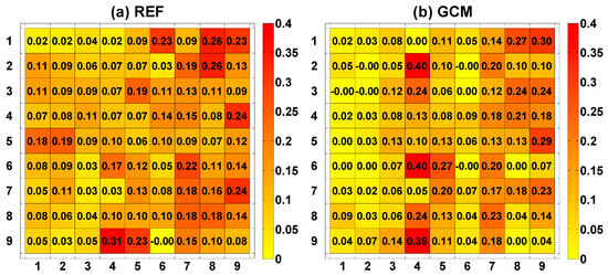 To assess the performance of the models, we calculated the correlation coefficient between the reference data (PROB_O matrix) and the model data (PROB_M matrix). The correlation coefficient serves as an indicator of how well the model’s output replicates the observed reanalysis data. A higher correlation coefficient suggests a stronger resemblance between the model’s simulation of extreme precipitation patterns and the reanalysis data.