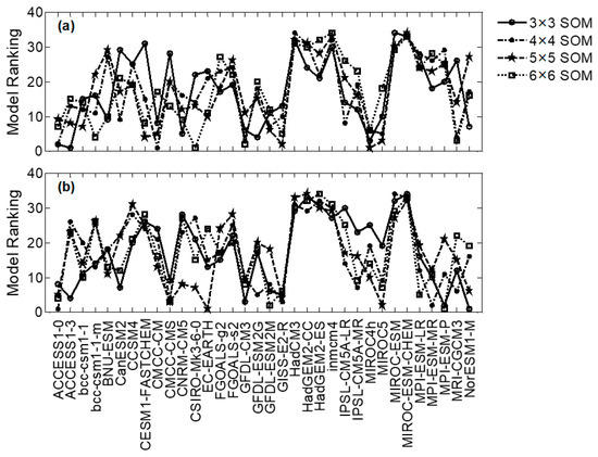 To investigate the sensitivity of model ranking to the selection of SOM size, we ranked the models using four different SOM sizes (3 × 3, 4 × 4, 5 × 5, and 6 × 6). The results showed a significant positive correlation among different sizes. Therefore, caution should be taken when selecting the SOM size in the evaluation method.