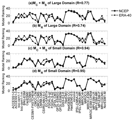 Comparison of the model ranking from the NCEP and ERA-40: (a) + of large domain, (b) of large domain, (c) + of small domain, and (d) of small domain.