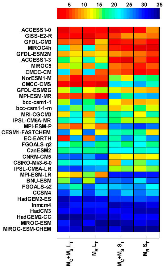 Figure 9 depicts the model ranking derived from a comprehensive set of evaluation measures used in this study. These measures were assessed using two distinct sets of reanalysis data. The colors assigned to each rank in the figure visually illustrate significant variations in model ranks across the evaluated measures. Certain models consistently achieved high ranks, such as ACCESS1-0 and GISS-E2-R, while others consistently obtained low ranks, including MI-ROC-ESM-CHEM and MIROC-ESM.