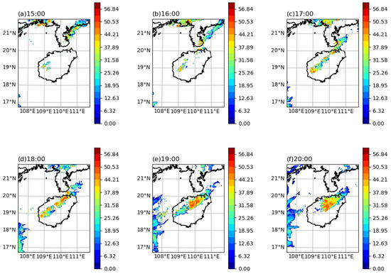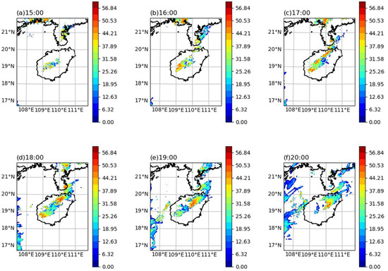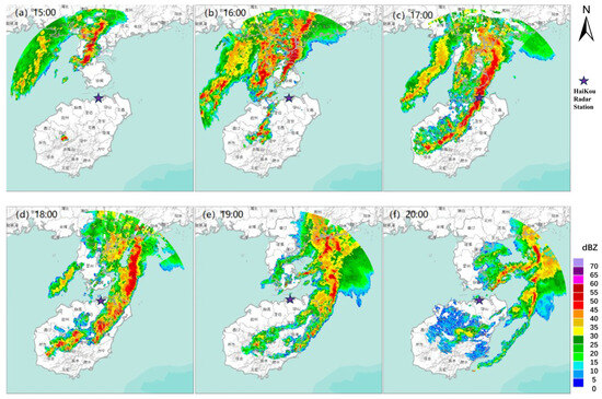 (a–f) The composite reflectance (unit: dBZ) of multiple operational weather radars in South China from 15:00-20:00(BST) on 22 April 2020, sourced from China Meteorological Data Network (http://data.cma.cn/ accessed on 11 August 2023).