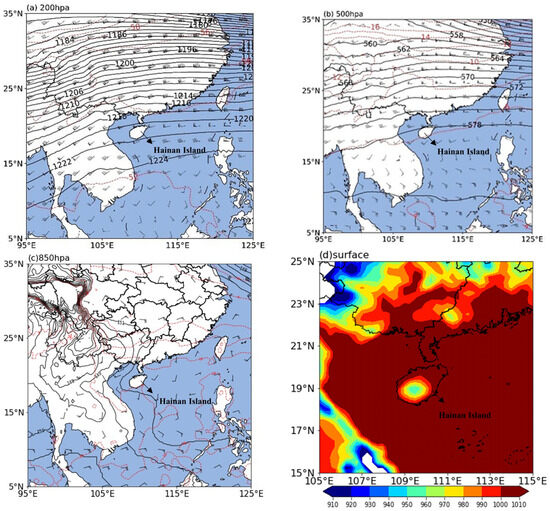 (a) 200 hPa height wind and temperature field (contourf, unit: dagpm) on 22 April 2020 (BST), (b) 500 hPa height wind and temperature field (contourf, unit: dagpm) on 22 April 2020 (BST), (c) 850 hPa height wind and temperature field (contourf, unit: dagpm) on 22 April 2020 (BST), and (d) sea level pressure field (contourf, unit: hPa) on 22 April 2020 (BST).