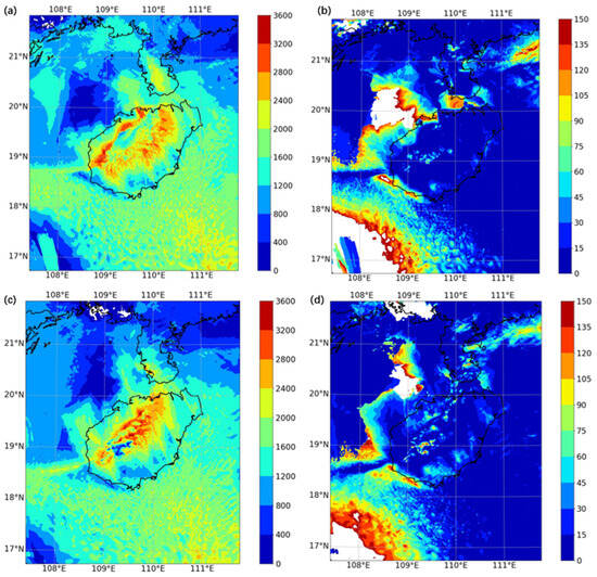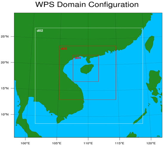For this simulation, a four-fold nesting scheme with two-way feedback (Figure 3) was employed. A simulation spin-up time of 22 h and a total integration period of 46 h were employed. The outermost layer of the model covers most of South Asia; the outermost nested grid had a horizontal resolution of 27 km and covered a domain of 217 × 229 grid points in the directions, respectively. The second grid had a horizontal resolution of 9 km and covered a domain of 100 × 100 grid points in both directions. The third grid has a horizontal resolution of 3 km and covers a domain of 343 × 385 grid points in the directions, respectively. The innermost layer focuses on Hainan Island and its surrounding waters, facilitating the analysis of thermal differences. The time integration step is set to 30 s. The horizontal resolution in the nested areas ranges from 27 km in the outer layer to 1 km in the inner layer, and the inner grid number is 463 × 568. The top model layer in the vertical direction is positioned at 50 hPa, and the vertical is divided into 81 layers. The physical parametric scheme used in the numerical experiment is presented in Table 1.
