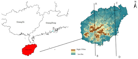 Hainan Island is located in the south of China, 18°09′–20°10′ N, 108°03′–111°03′ E, which has a unique geographical feature (Figure 4). The center of the island, where the mountains are located, is in the southwest region, while the northeast area, where the plains are found, spans both sides of the island. Hainan Island is strongly influenced by the sea breeze [29] and is covered by a lot of vegetation [30].