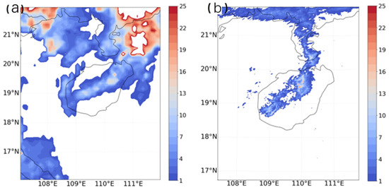 Furthermore, the simulation’s effectiveness was further examined by comparing the distribution of actual and simulated cumulative precipitation. According to the simulated cumulative precipitation (Figure 6a), the precipitation area extended in a southwest-northeast direction, with most of the precipitation located in the south of Haikou. The accumulated precipitation exceeded 20 mm, while most other areas exhibited values above 13 mm. In comparison to the corresponding actual cumulative precipitation (Figure 6b), the magnitude of the central precipitation area in both the actual and simulated cases was approximately similar. However, the actual precipitation area slightly shifted eastward in comparison to the simulated precipitation area, although the deviation was minimal. In summary, this numerical simulation effectively captured the complete precipitation process, with the simulated precipitation intensity and distribution closely resembling the actual situation.