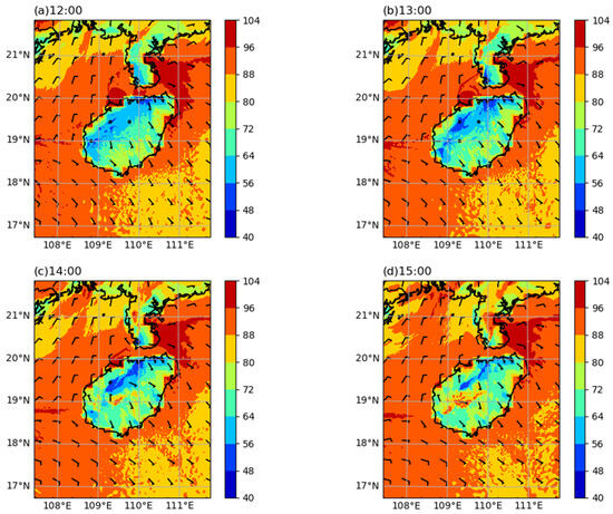 (a–d) Simulated 10-m wind direction field (unit: m·s−1) and 2-m relative humidity field (unit: %) from 12:00 to 15:00 (BST) on 22 April 2020.