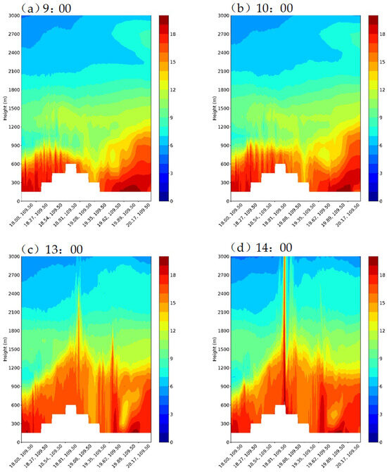 The squall line process is closely tied to the convergence of sea breezes on the north and south sides of Hainan Island. To study the transport of water vapor via the sea breeze, a meridional cloud water profile is constructed from (18°N, 109.5° E) to (20.4° N, 109.5° E). The vertical distribution of the water vapor mixing ratio, cloud water mixing ratio, and rainwater mixing ratio is examined. From 9:00 to 10:00, the cloud water content primarily resides in the boundary layer below 1000 m (Figure 8a,b), with a higher content in coastal areas. As the sea breeze transports water vapor inland and converges, the cloud water content rapidly increases between 13:00 and 14:00 (Figure 8b,c), which is two hours before the squall line occurs. The vertical distribution of cloud water content expands at 0–1500 m, indicating a significant increase in water vapor in the vertical direction. This upward movement is attributed to the convergence of the sea breeze, resulting in a pyramid-shaped distribution with higher content in the middle and lower areas.