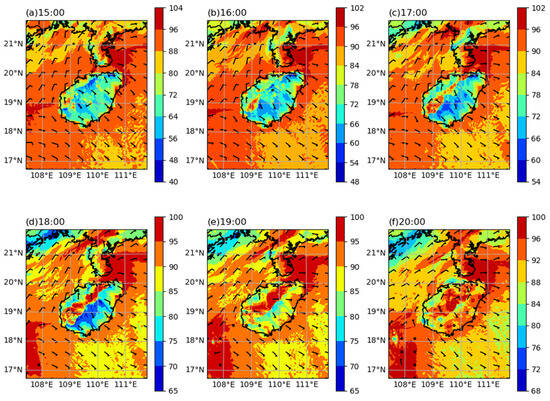 (a–f) Topographic sensitivity test of the simulated 10-m wind direction field (unit: m·s−1) and a 2-m relative humidity field (unit: %) from 15:00 to 20:00 on 22 April 2020 (BST).