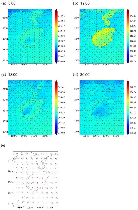 (a–d) Simulated sea surface and land temperature (unit: k) on 22 April 2020 (BST) with simulated 10-m wind field (unit: m·s−1) (e) simulated superposition of 500 hPa horizontal wind field (black) and 850 hPa horizontal wind field (red) (unit: m·s−1).