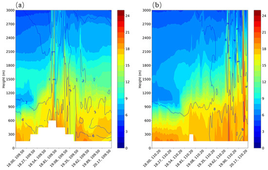 By taking another look at the cloud water profile and vertical velocity superposition created at 16:00 (Figure 13b) from (18° N, 110.2° E) to (20.4° N, 110.2° E) (CD in Figure 3b), it can be seen that the vertical velocity near the Haikou is approximately 4–8 m·s−1. The highest lifting velocity of the bottom layer is 8 m·s−1, which is larger than that of the bottom layer of Wuzhishan, and the decline rate of vertical velocity with height is smaller than that of the former. The increased vertical uplift in Haikou compared to that in Wuzhishan also indicates that there is a more intense squall line system near Haikou. At the same time, it can be seen that the vertical velocity at both times extends to approximately 3000 m, breaks through the boundary layer height, and reaches the free convection height (LFC) near 2000 m. When the gas block rises to this height, it rises freely and creates convection that develops independently [39].