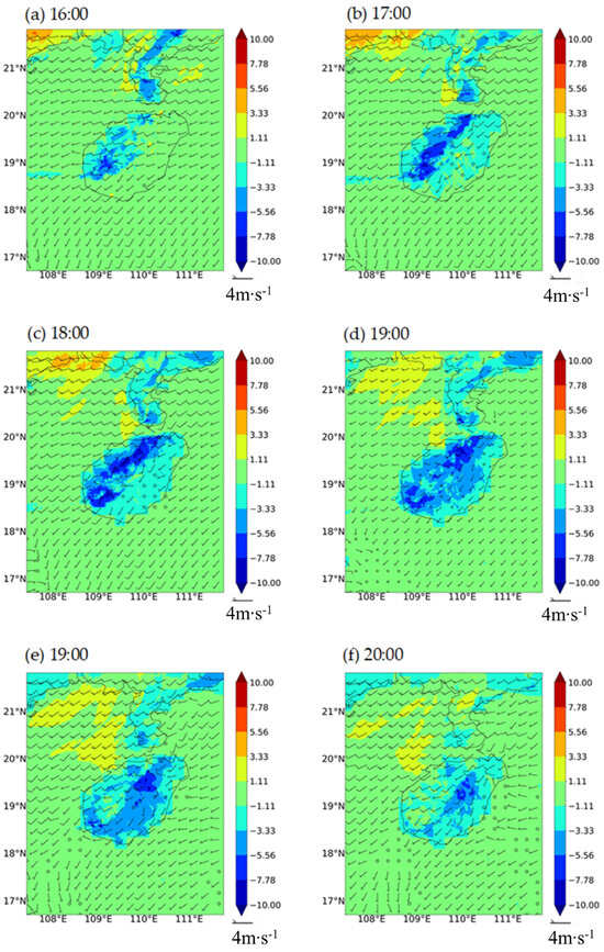 (a–f) simulated 3 h variation of ground potential temperature at 10 m (unit: k) and simulated vertical wind shear from 700 hPa to 900 hPa (unit: m·s−1) numerically on 22 April 2020 (BST).