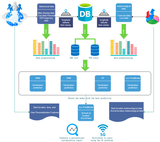 The methodology employed in this study comprises several key steps. Firstly, we collect and analyze users’ travel behavior data to extract travel features and preferences. Subsequently, utilizing the XGBoost algorithm [27] from machine learning, we construct a predictive model for users’ future locations, capable of accurately forecasting their upcoming destinations. Following this, personalized meteorological data reports are generated based on users’ personal characteristics and the meteorological indicators of their higher interest. Finally, leveraging the 5G messaging platform technology, these personalized meteorological reports are precisely delivered to users, achieving an intelligent and personalized weather service.